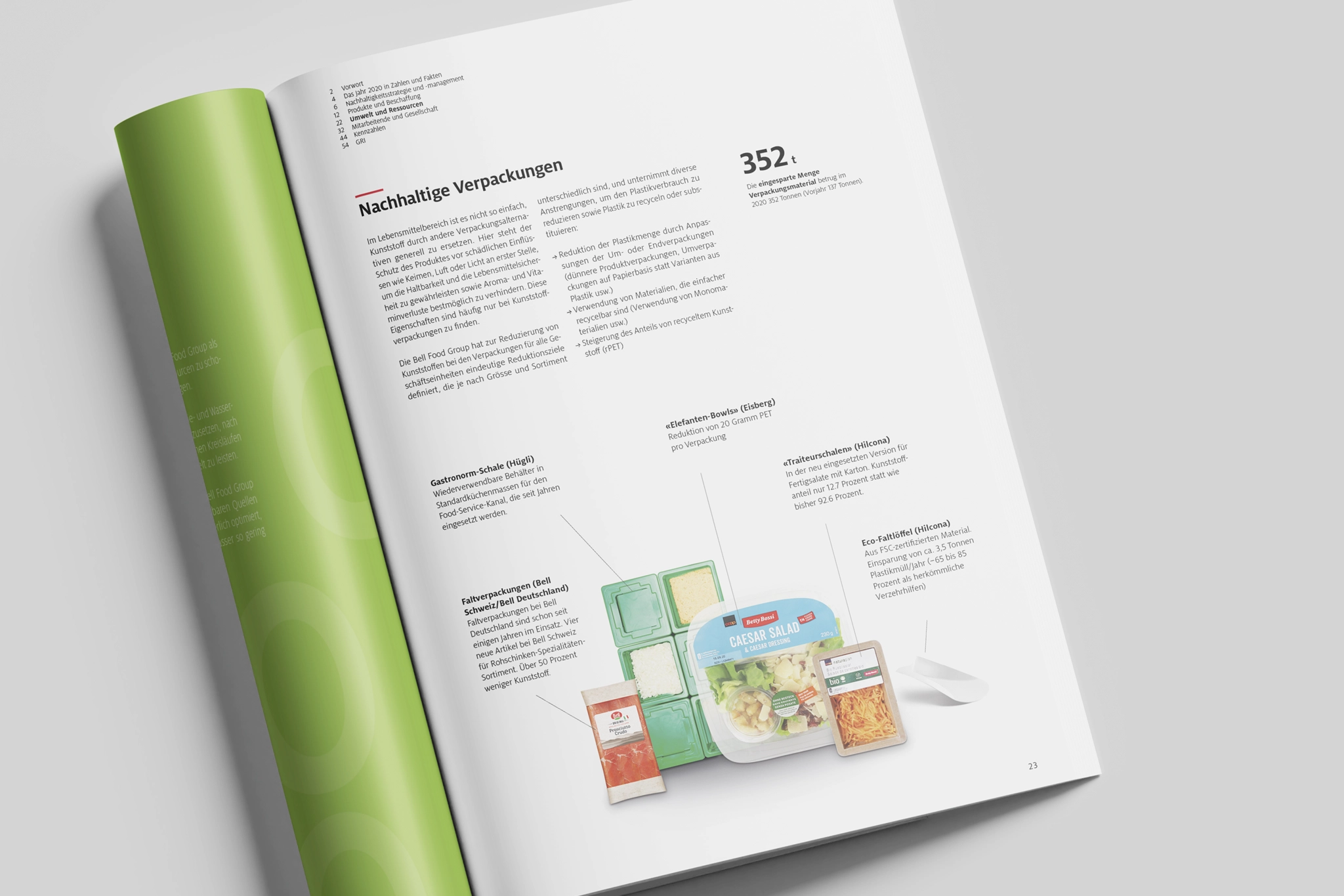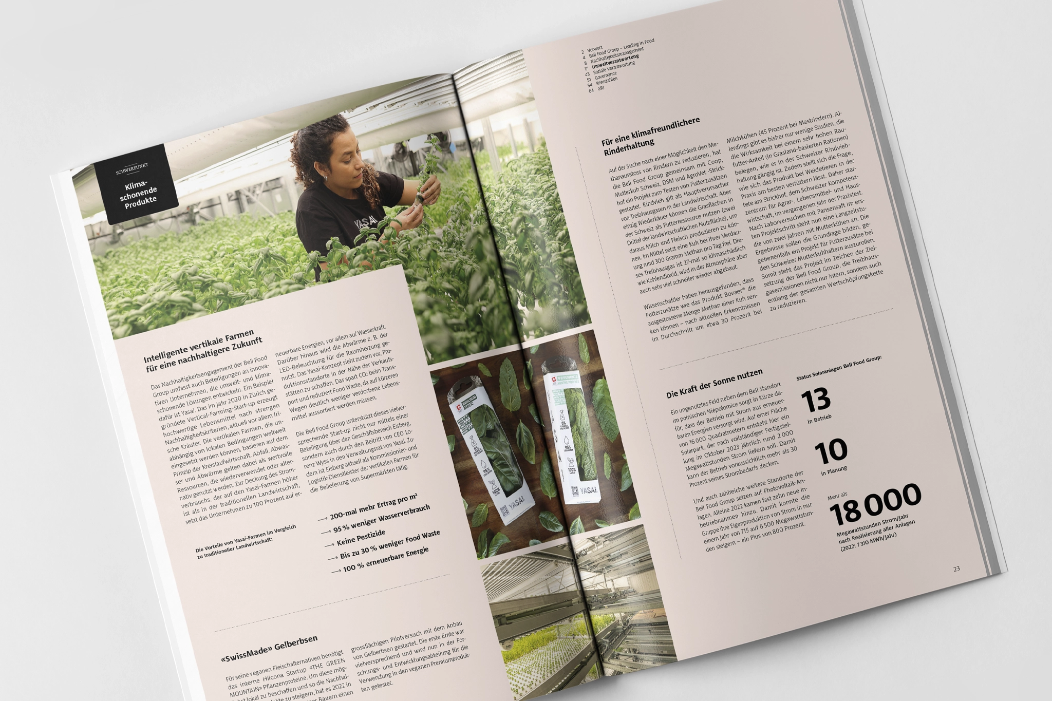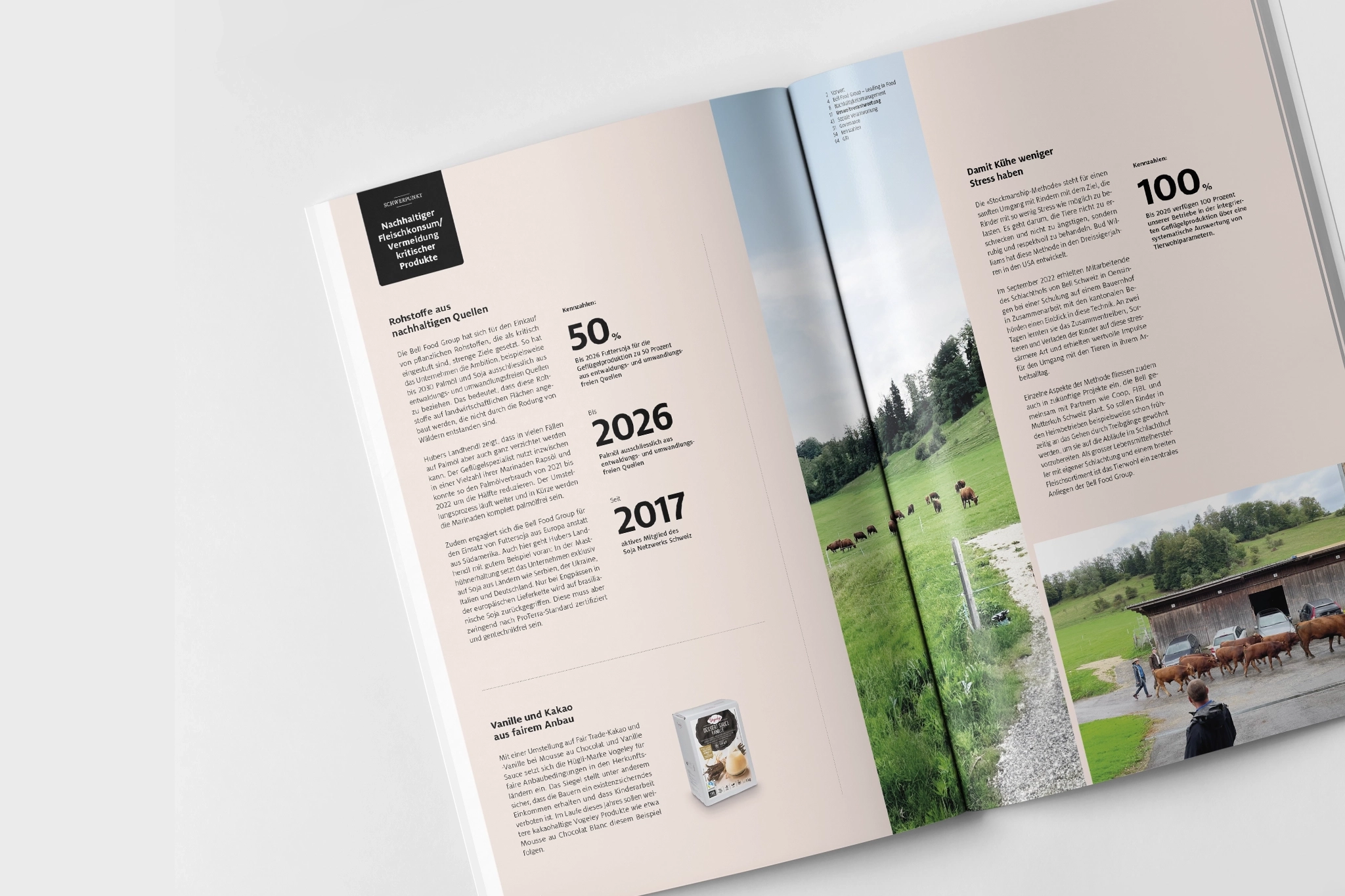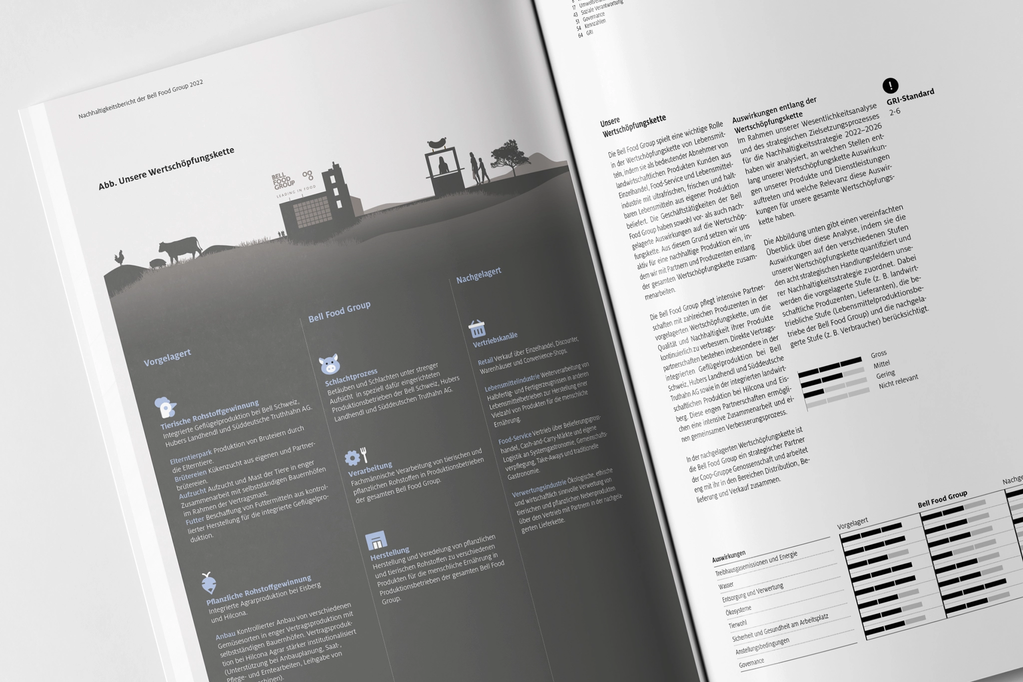 Die Nachhaltigkeitsberichterstattung der Bell Food Group behandelt die Hauptthemen Umwelt- und Sozialverantwortung sowie Governance und ergänzt diese ausführlich mit Tatbeweisen in Form von Stories zum Stand der Umsetzung, die in der Regel weit über die gesetzlichen Mindestanforderungen hinausgeht. Der Bericht ist entsprechend reich bebildert und durch Aussagen und Infografiken angereichert. Der inhaltliche Aufbau erschliesst sich durch stringente Anwendung von Navigation, Farbcodes und Kapiteltrennern besonders schnell.