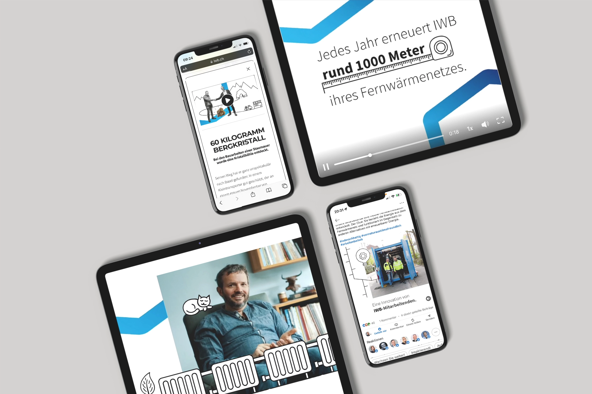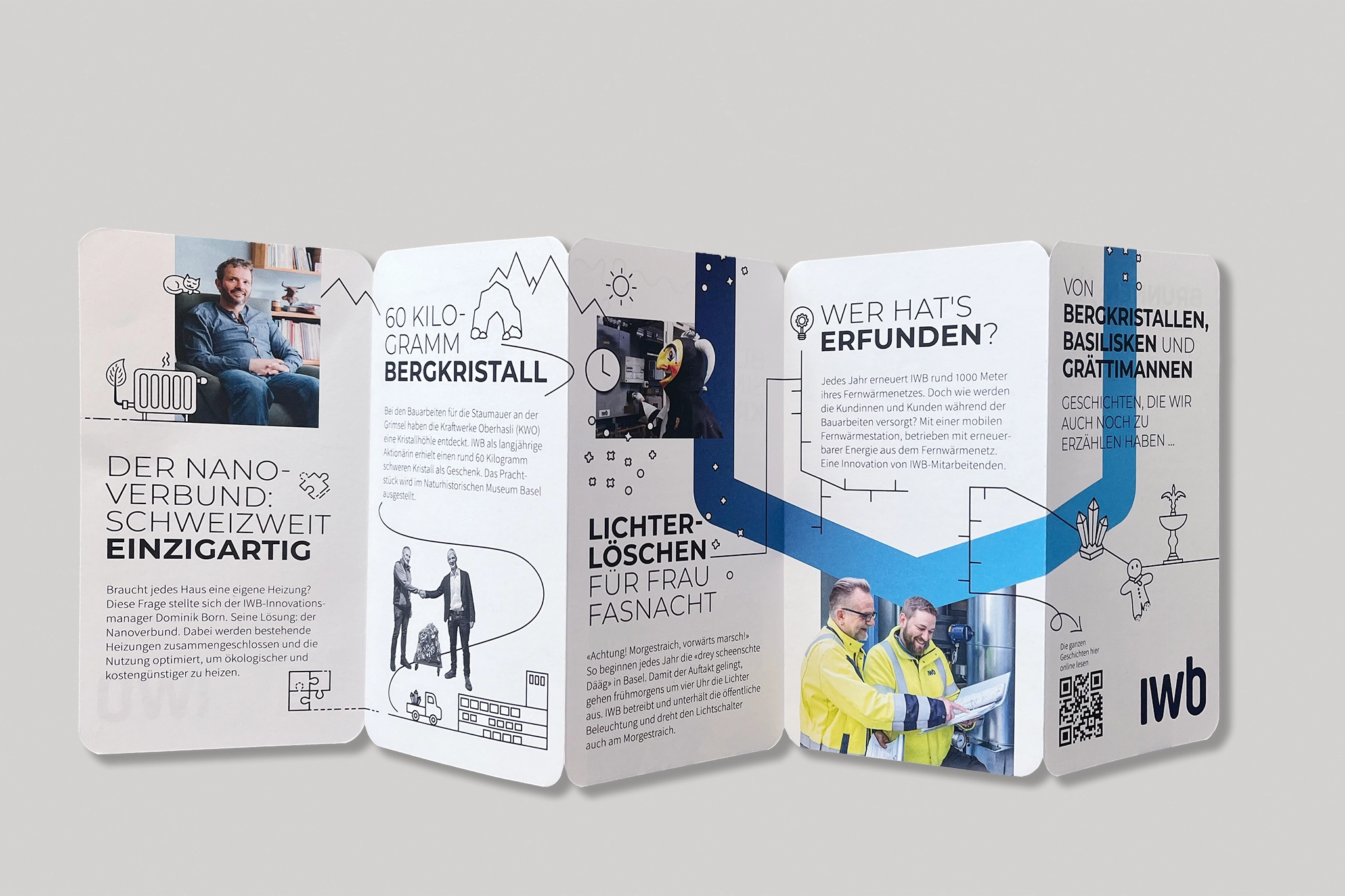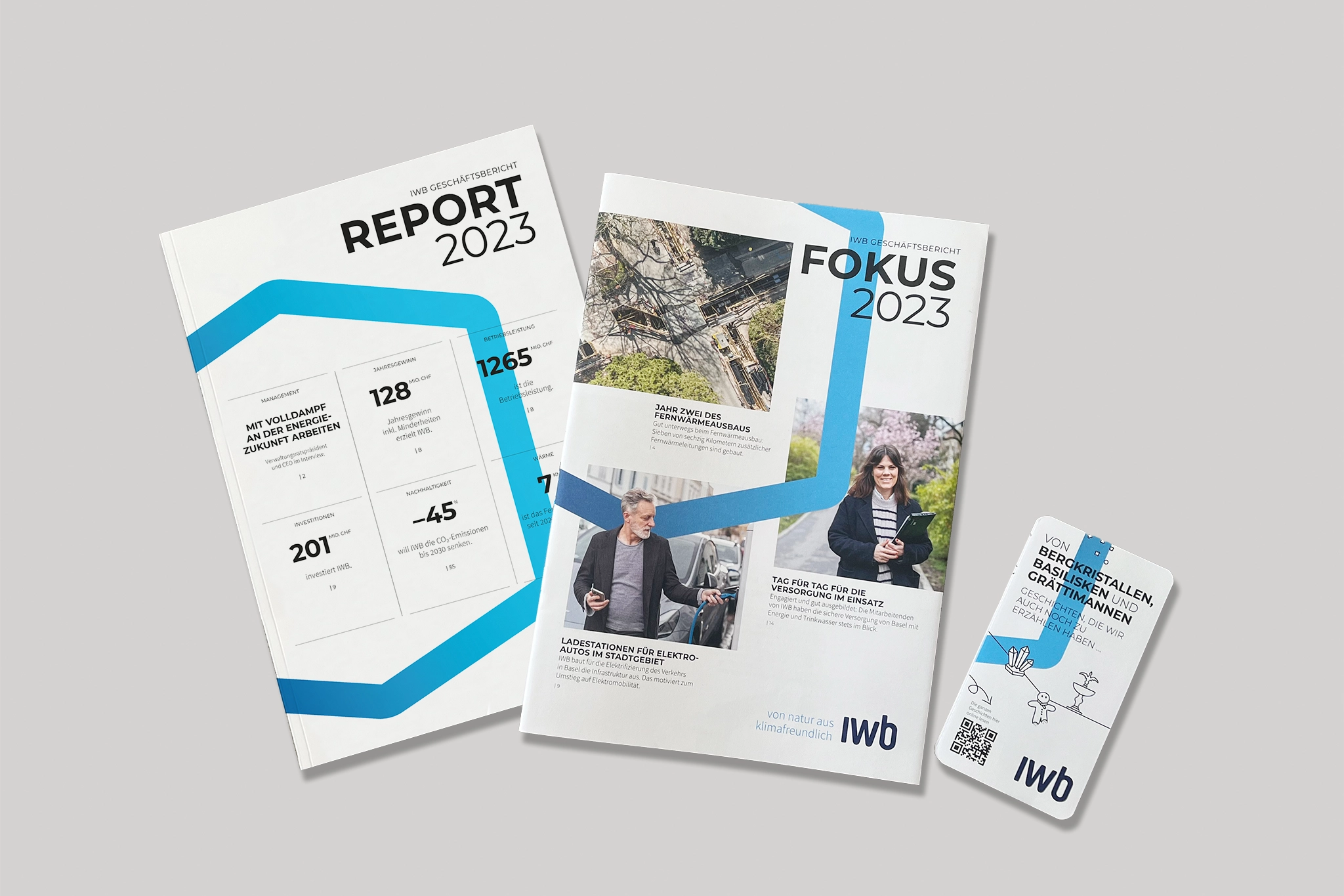 Die IWB-Geschäftsberichtserstattung begleiten wir in Konzeption, Design und Text. Der Geschäftsbericht soll bei den relevanten Stakeholdern die Wahrnehmung von IWB positiv beeinflussen und damit den Markenkern stärken. Diese Aufgabe erfüllt vor allem der dem Report 2023 (Lagebericht, Jahresabschluss, nichtfinanzieller Bericht) beiliegende als Magazin ausgestaltete Fokus 2023. Auf 16 Seiten werden die wesentlichen Ereignisse sowie die Fortschritte in der Strategieumsetzung dem Lesenden mit Geschichten, Bildern, Zahlen, Zitaten und Infografiken attraktiv zugänglich gemacht. Ein dem Fokus beigelegtes Leporello erzählt Geschichten, die es nicht in den Geschäftsbericht geschafft haben, aber es wert sind erzählt zu werden.