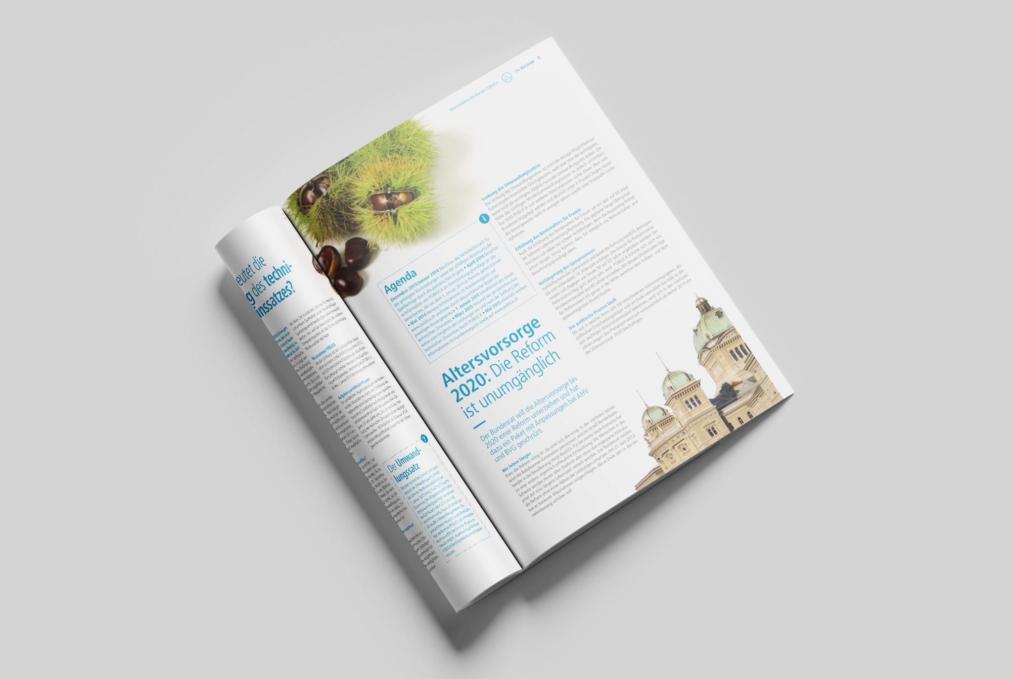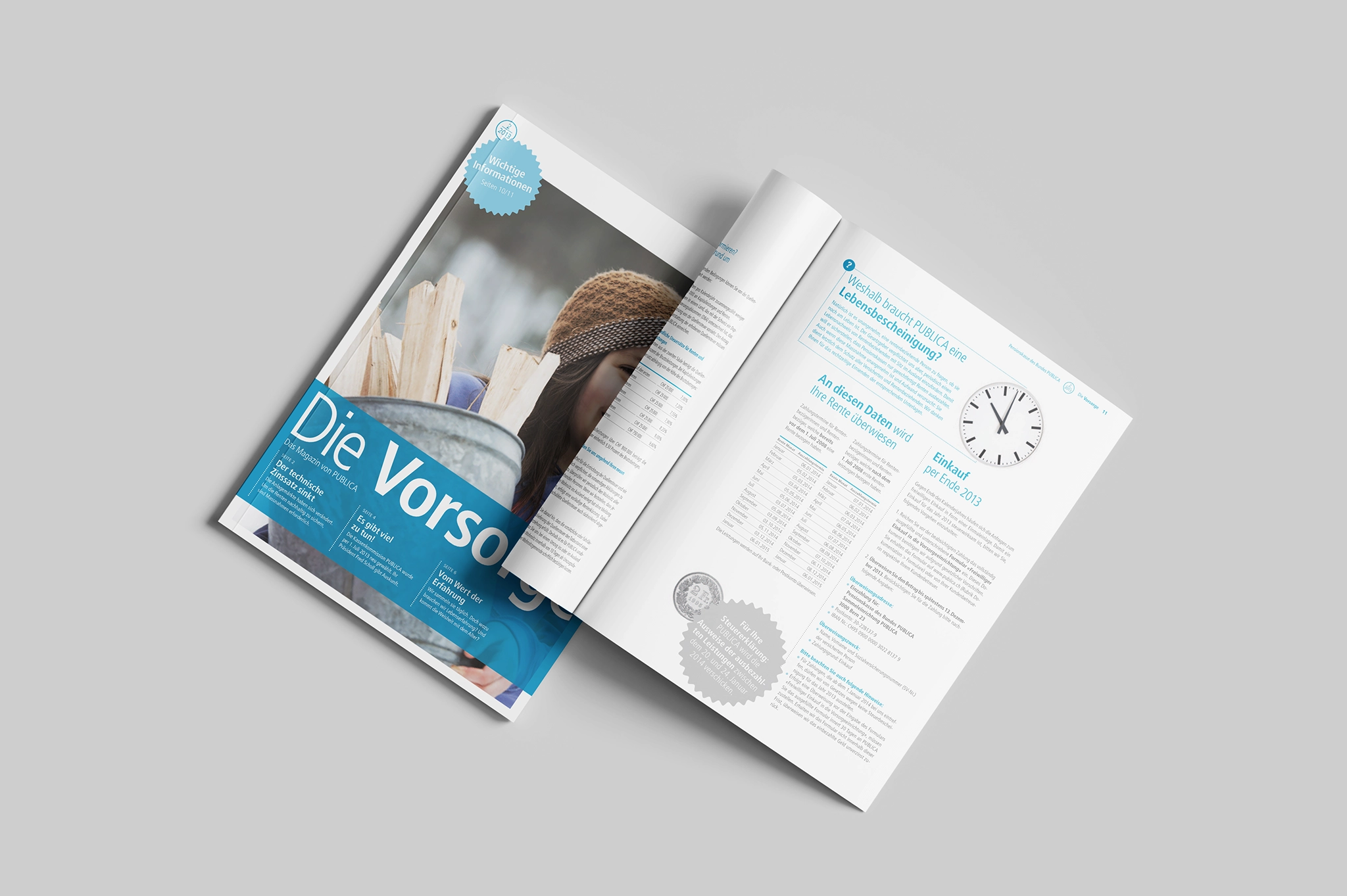 Zum 10 jährigen Jubiläum durften wir das Magazin «Die Vorsorge», das sich sowohl an Kunden wie auch Mitarbeiter von Publica richtet, neu gestalten. Zusammen mit unserem Partner Klarkom (Texte und inhaltliche Konzeption) wollten wir dieser 12-seitigen Publikation mit Banderole ein neues, attraktives Gesicht geben. Mit einem neu gestalteten Logo und dem gestalterischen Fokus auf runde Formen, die unsere Leitidee «rundum stark» visualisieren, haben wir das Magazin neu inszeniert.