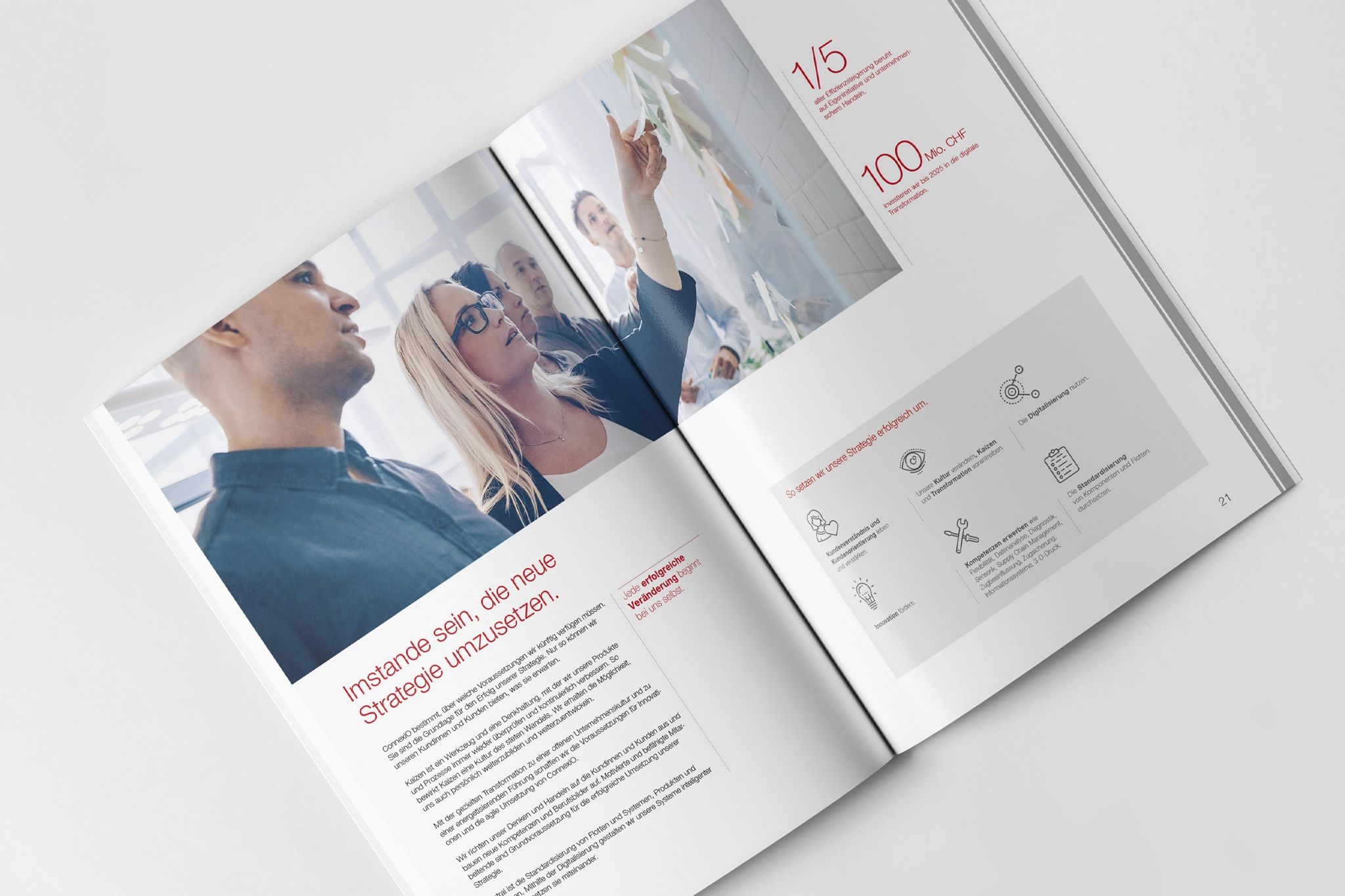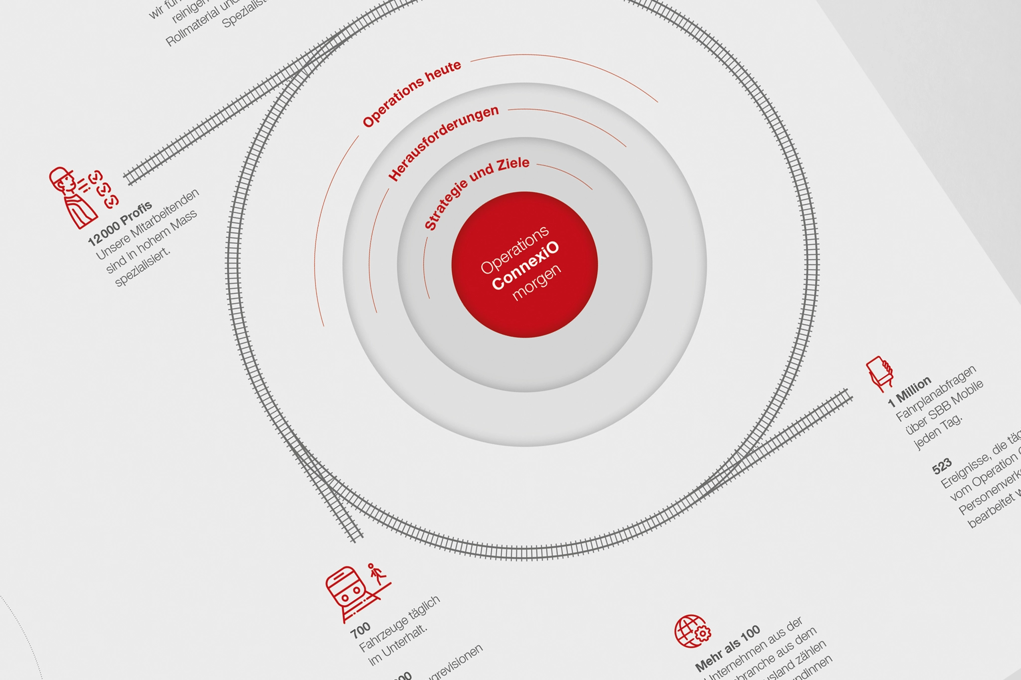 In Kooperation mit Klarkom erarbeiteten wir die Broschüre ConnexiO, die SBB hilft, ihre Strategie sowie die entsprechenden Handlungsfelder intern und für ausgewählte Anspruchsgruppen verständlich zu machen. Thematisiert werden insbesondere Voraussetzungen, Kulturwandel, Standardisierung und Digitalisierung. Wir wählten eine konzentrische Anordnung der Themen vom Grossen ins Kleine, vom Allgemeinen ins Konkrete, die in der Vision einer SBB der Zukunft mündet und aufzeigt, wie die diversen Herausforderungen auf dem Weg dorthin gelöst werden.